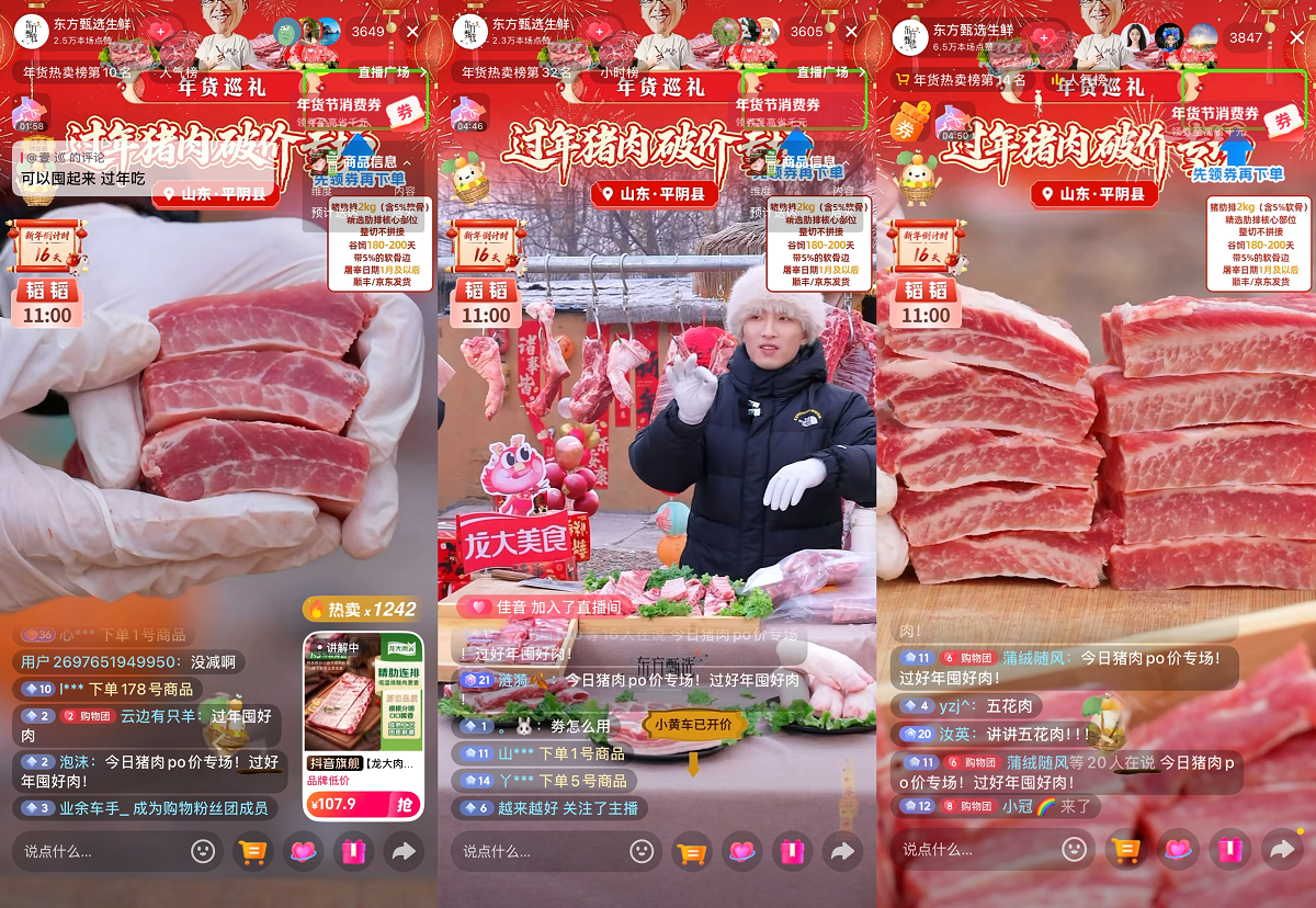 2月1日,东方甄选生鲜号“过年猪肉 破价专场”直播在山东济南平阴县圆满落幕。本场直播聚焦春节家庭品质餐饮需求,农业产业化国家重点龙头企业龙大美食的猪肋排、五花肉等多款核心产品赢得消费者热烈响应,最终实现单场销售额400余万元。